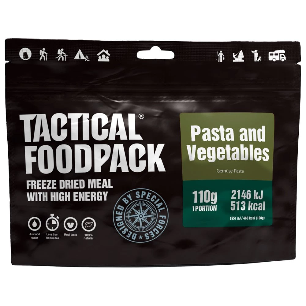 Idéales pour profiter d’un bon repas roborant, les Pâtes et Légumes 110g Tactical FoodPack sont lyophilisées pour améliorer leur durée de conservation et faciliter leur transport.